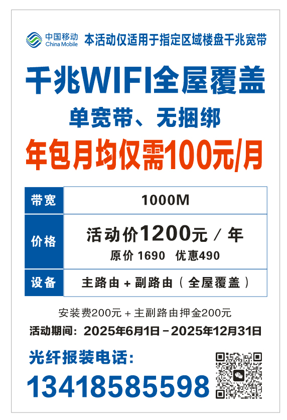 300M 一般80-100元一个月,适合家庭上网、看电视、刷抖音